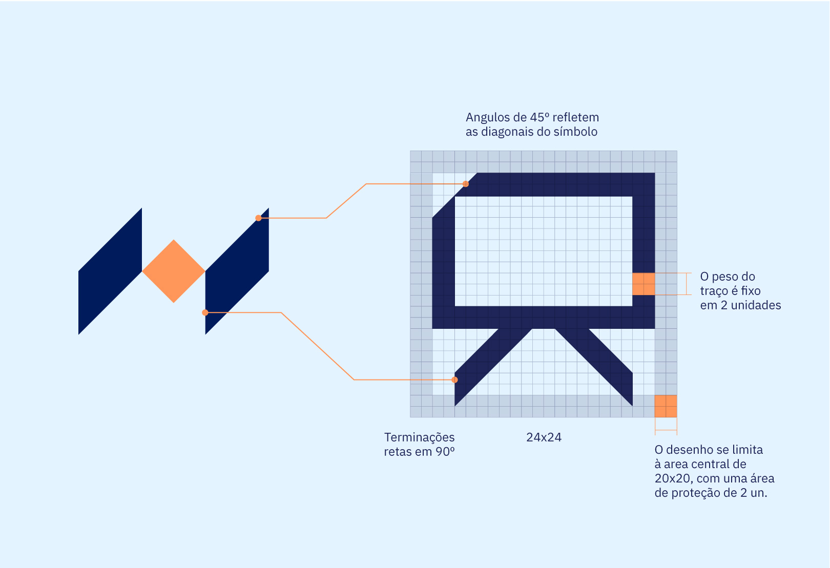 Para garantir que nossos ícones sigam um estilo unificado e consistente, introduzimos um conjunto básico de regras para seu desenho. Isso inclui definições sobre grid, traço, ângulos e tratamento dos cantos.