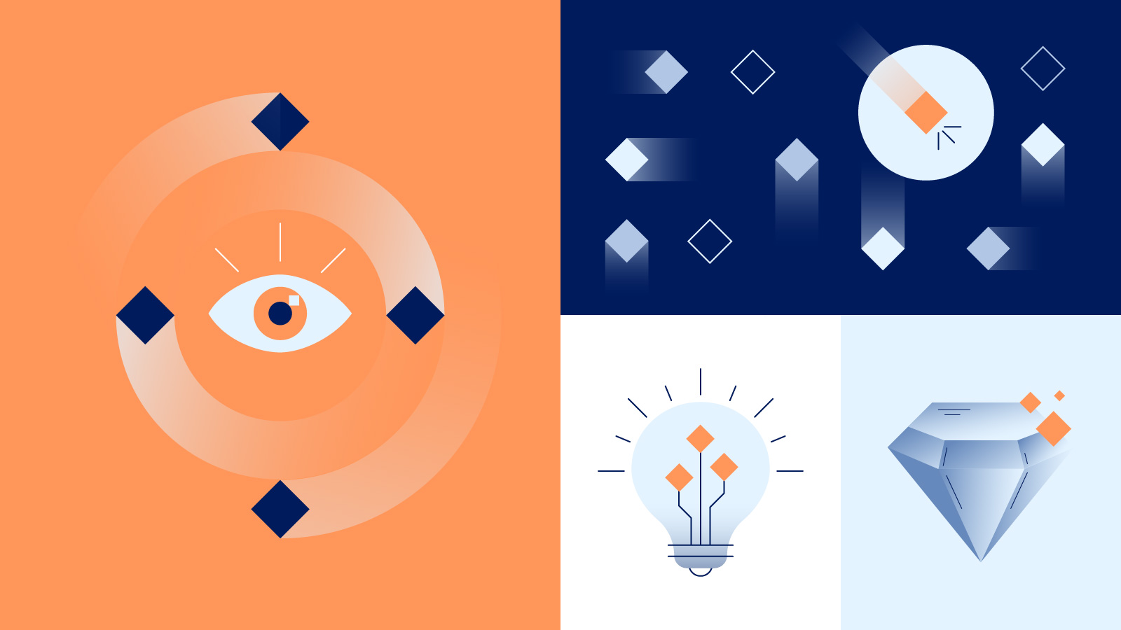 Nosso estilo de ilustração expande a nossa linguagem gráfica para criar composições mais complexas, quando precisamos abordar assuntos abstratos de forma visualmente impactante e proprietária.